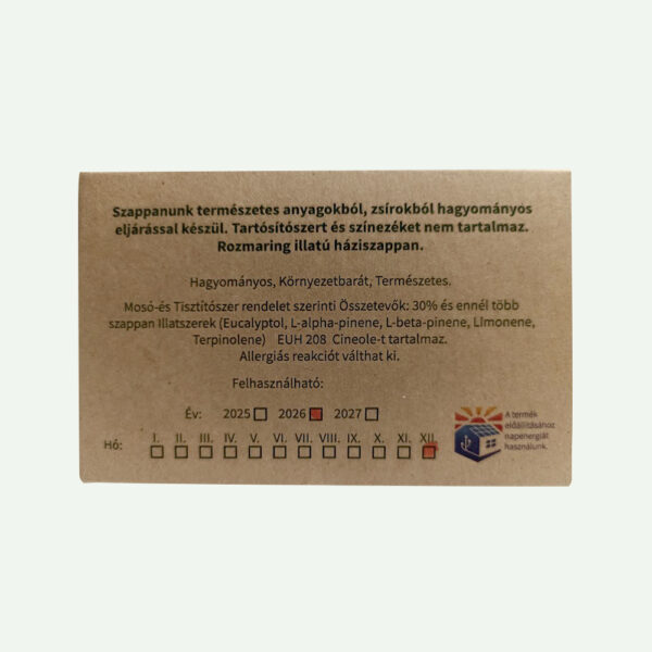 Termék összetétel: Háziszappan, őrölt rozmaring, 100% tisztaságú rozmaring olaj.